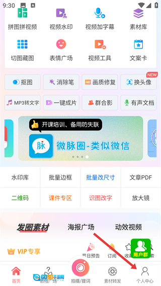 打开微脉水印相机应用程序,点击底部的【个人中心】选项,进入相应的页面。