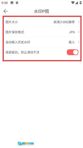 在【水印P图】的设置页面中,您可以对【图片大小】、【图片保存格式】等各项参数进行调整。