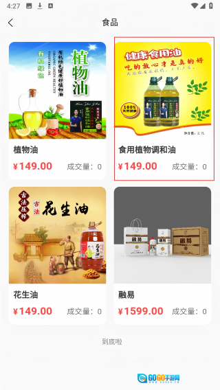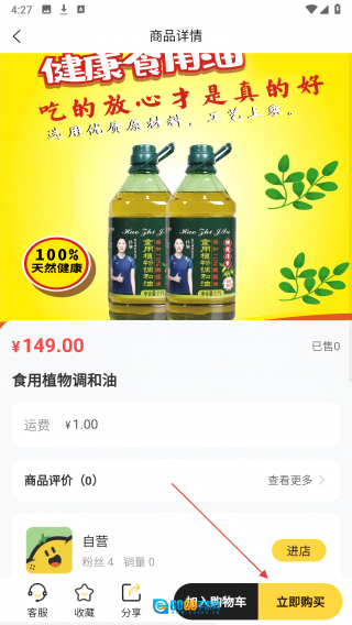 在食品商品列表里,点击【食用植物调和油】的商品卡片,就能进入该商品的详情页面,查看价格、运费等相关信息。