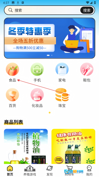 在应用首页找到【食品】分类的图标并点击,随后进入食品类商品的列表页面进行商品浏览。