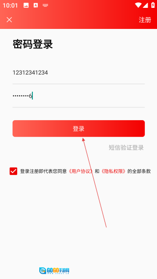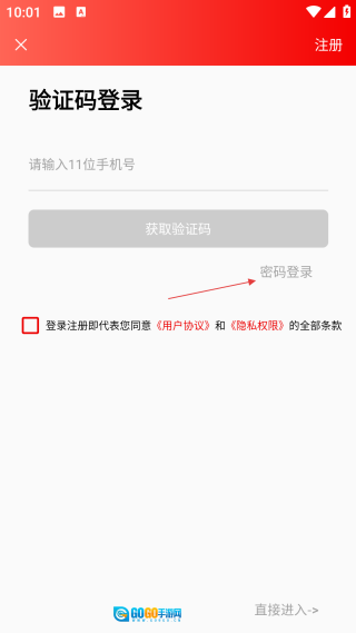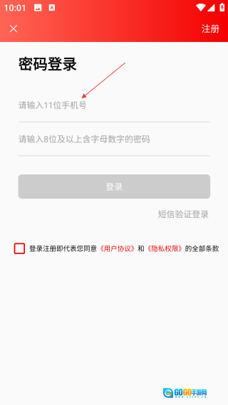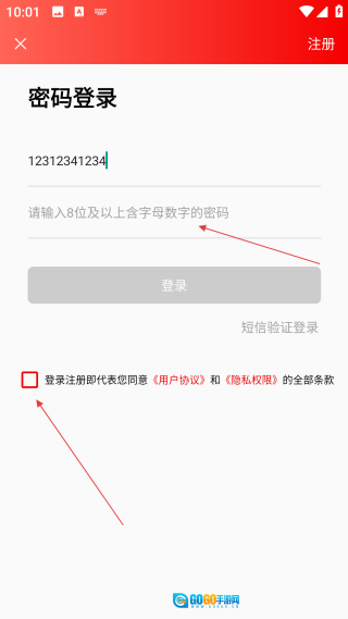 在填写完手机号码后,请先【勾选协议】,接着点击【密码输入框】,为输入密码做好准备。
