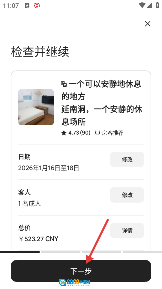 在预订确认页面,核对房源、日期、客人以及总价等信息无误后,点击【下一步】按钮,就能继续推进预订流程的完成。
