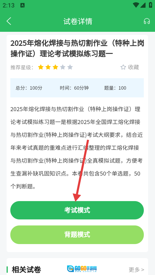 接下来进入试卷详情页面,在熟悉相关信息后,点击页面下方的【考试模式】按钮。