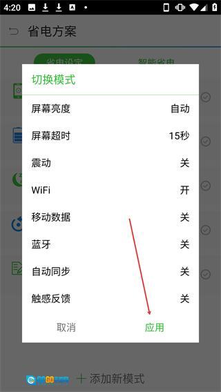 在【切换模式】弹窗里,确认好设置后点击【应用】按钮,就能回到省电方案页面。