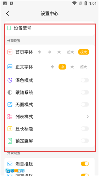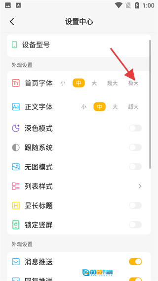 在设置中心的“外观设置”板块,找到“首页字体”选项,选择目标字号(如“极大”)。