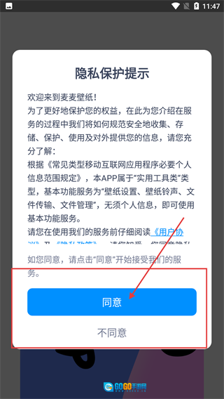 打开麦麦壁纸后,会弹出【隐私保护提示】,点击【同意】按钮,就能进入软件主界面。