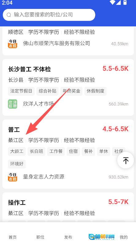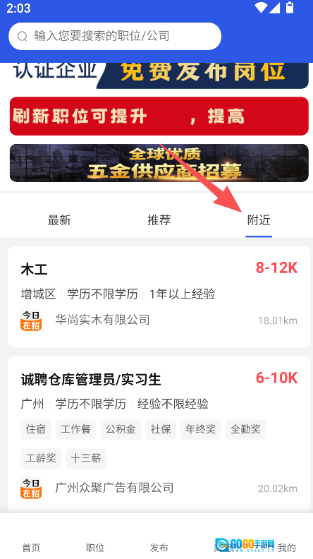 提供职位分类功能,选择附近等板块,查看对应区域的招聘职位列表及基础信息。
