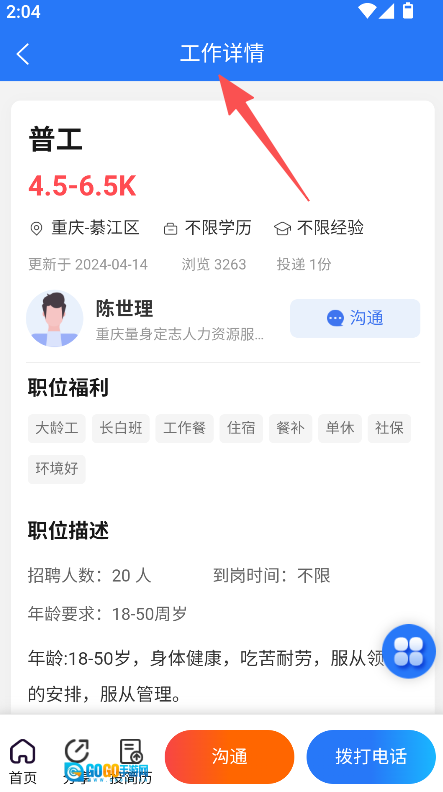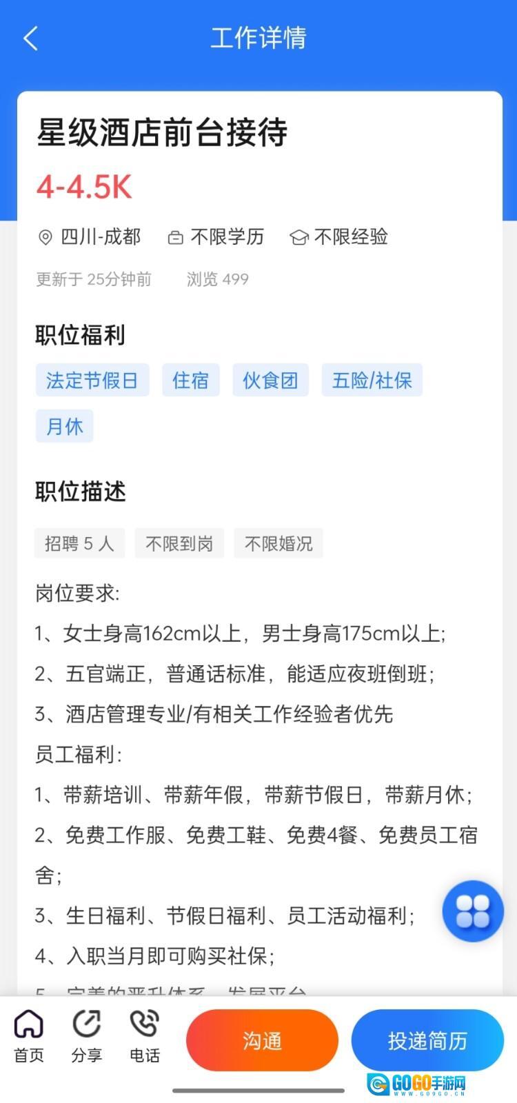 可以查看工作的详细信息,了解职位对应的福利和具体描述,通过点击沟通按钮或投递简历来完成求职过程中的互动操作。