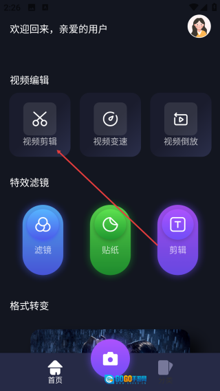 进入首页后,点击【视频剪辑】选项,即可进入相机胶卷的视频选择页面。