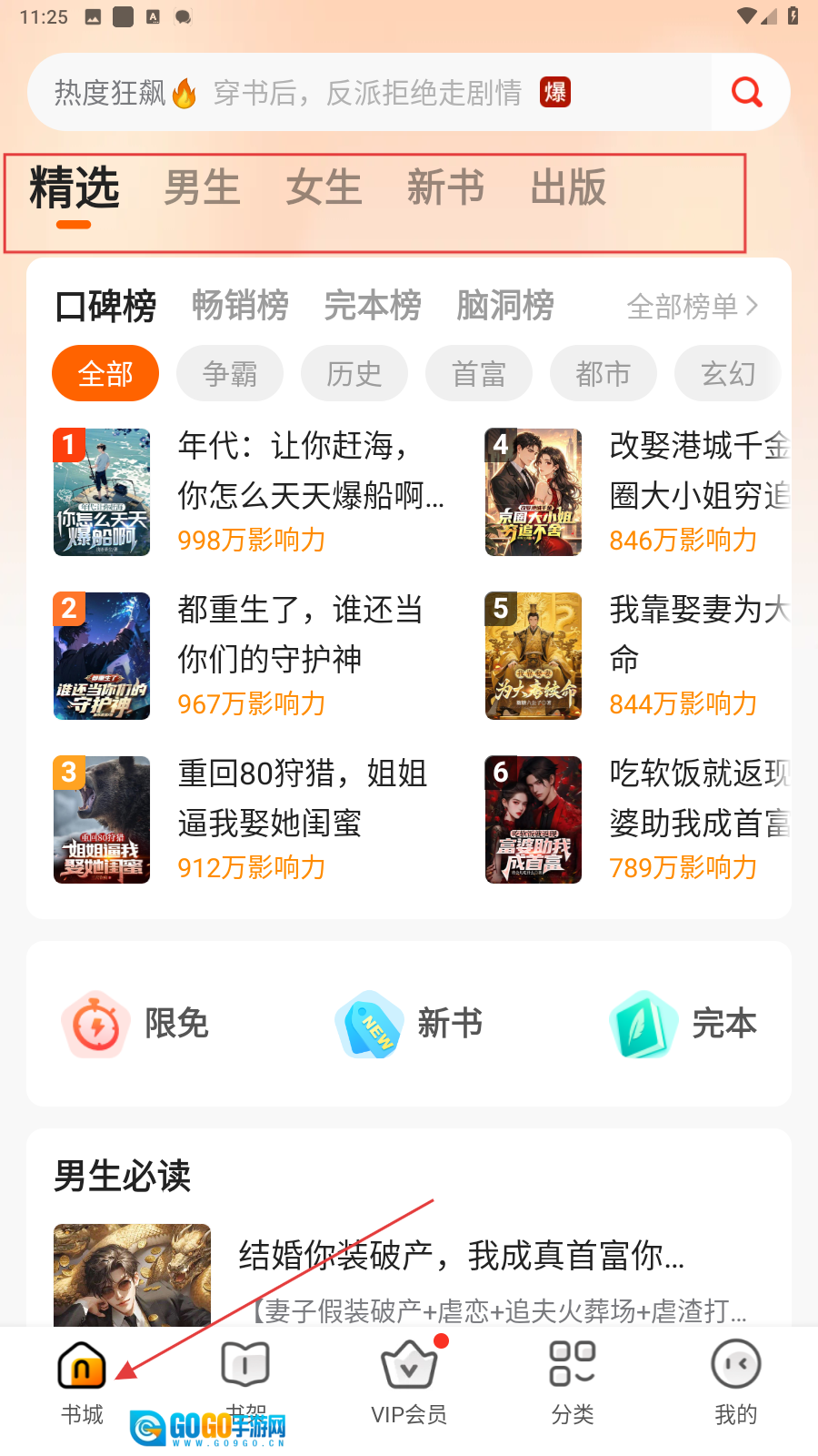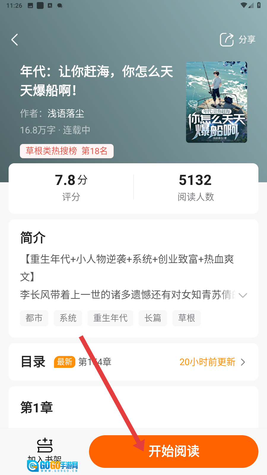 在【书城】的【精选】等分类中,挑选自己感兴趣的小说,比如《年代:让你赶海,你怎么天天爆船啊》。