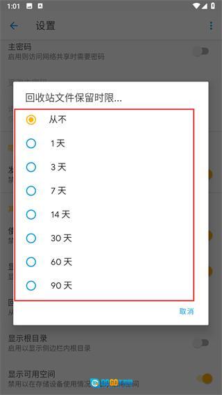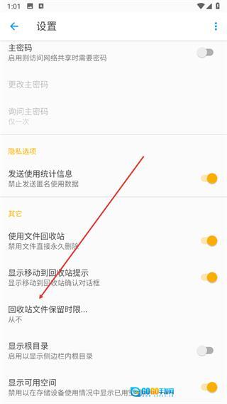 找到回收站文件保留时限选项,点击弹出选择菜单。