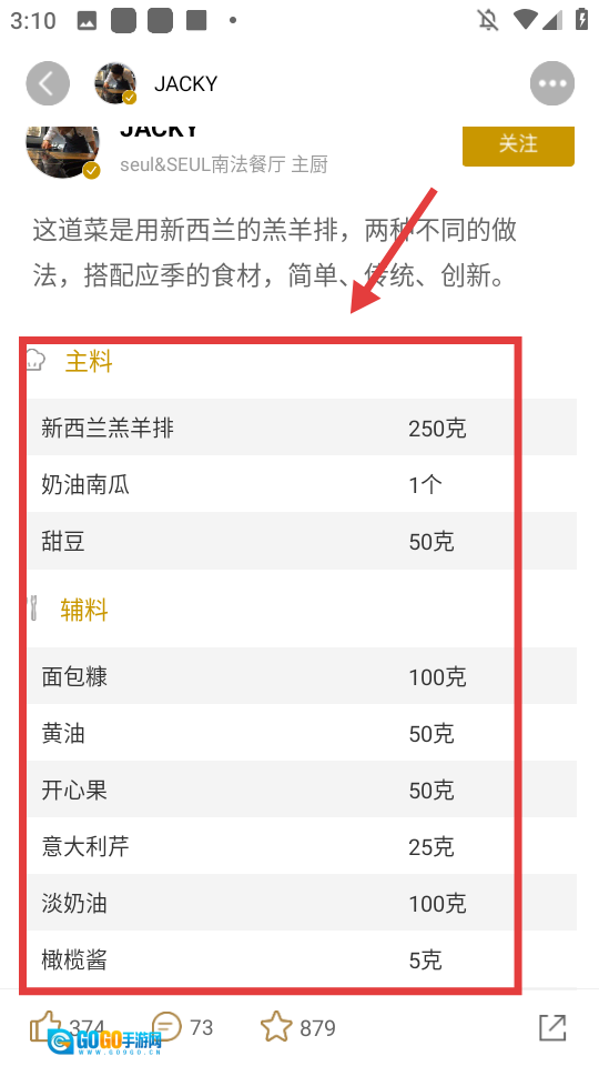 在菜品详情页查看主料、辅料等食谱信息。