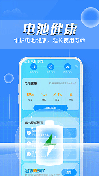 掌上电池医生是一款围绕智能算法构建的手机电池全周期守护与优化应用,专注于解决用户在充电效率、电池寿命、设备温控等方面的核心需求,直击久充损伤电池、设备高温发热、续航能力衰减等使用痛点。它具备实时监测、智能充电、动态降温、健康诊断、续航优化五大核心功能,依托精准的电池损耗算法与高效的后台管理技术,24小时不间断追踪电池状态,从充电过程中的三段式防护,到日常使用时的耗电智能管控,再到设备高温时的自动降温调节,构建起覆盖电池全生命周期的完整守护链路。