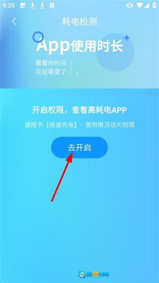 在耗电检测界面,点击【去开启】按钮,授予权限后即可查看高耗电情况。
