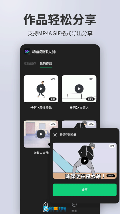提供多种的输出格式选择,包括MP4视频和GIF动图,还能导出透明背景的PNG图片序列。