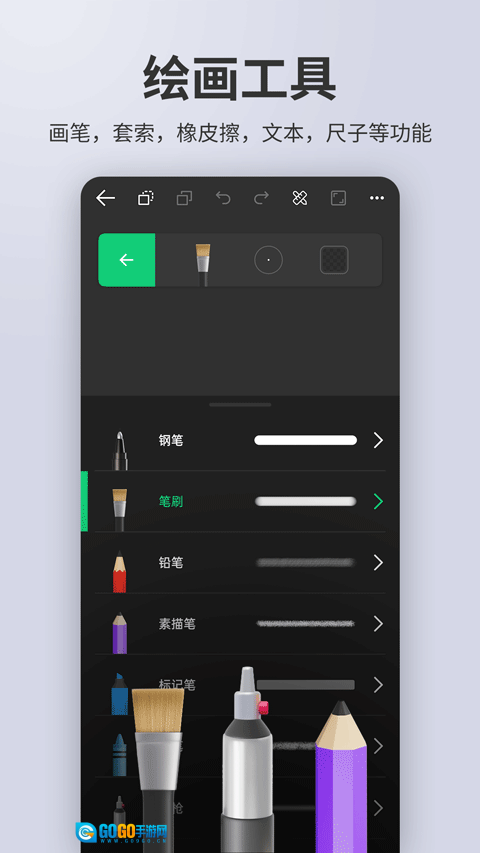 配备专业级的绘图工具套装,包含多种画笔类型、填充工具和文本添加功能,满足各种绘画需求。