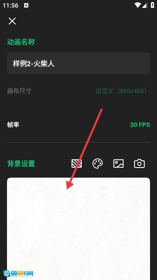 在项目设置界面能够查看和设置动画名称、画布尺寸、帧率、背景等各项参数。