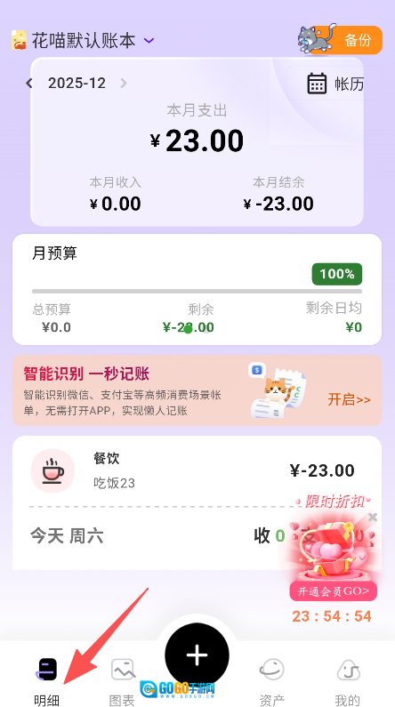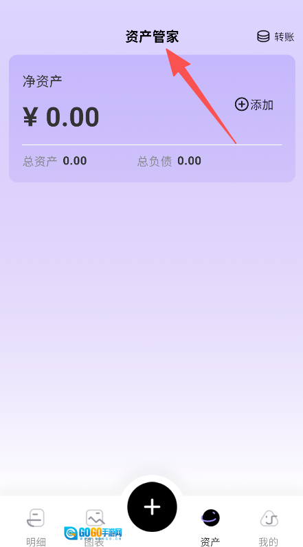 打开软件进入明细页面,点击加号添加收支记录。