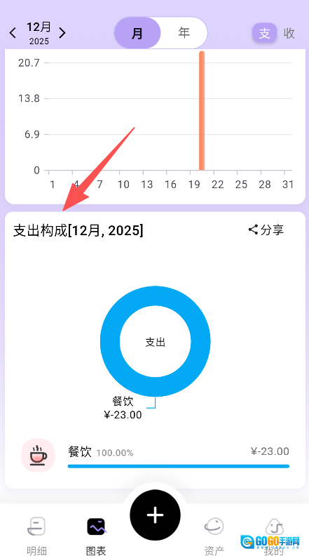进入图表板块,查看支出构成以及本月的收支、结余情况。