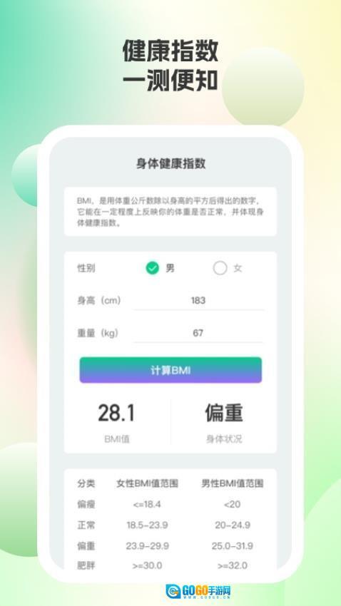 这是一个基础的身体质量指数计算工具,您只需输入几项简单数据,就能快速得到对应的评估参考值。