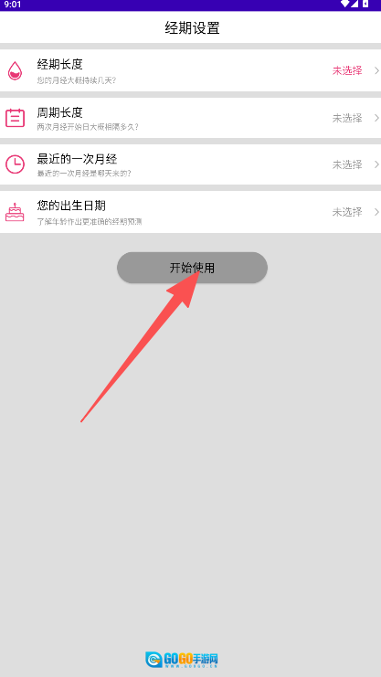 在经期设置页面中,先填写好经期长度、周期长度这类基础信息,之后点击“开始使用”按钮。