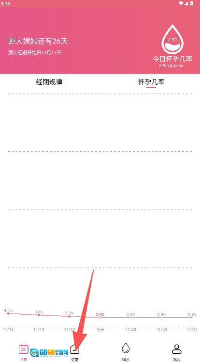 界面设计直观清晰,首页显眼位置展示着距离下次经期的天数、怀孕几率等重要数据。