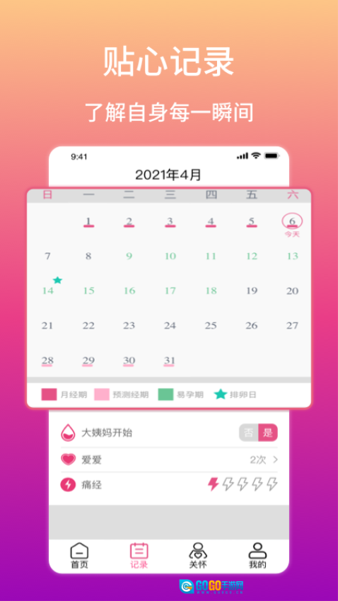 功能分区清晰合理,四大导航模块分别对应预测、记录、提醒等核心使用场景。