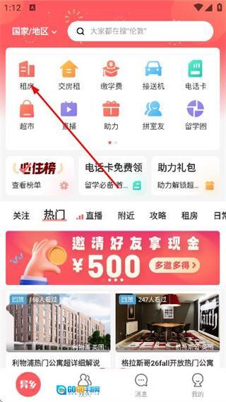 1、在应用首页点击租房选项,进入异乡好居的租房页面。