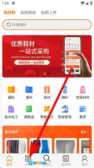 2、进入分类页面后,找到面料分类并点击其中的PU革选项,即可进入对应的商品列表页面。