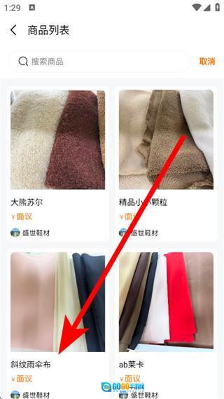 3、在商品列表页面,找到目标商品斜纹雨伞布并点击,进入其详情页面。