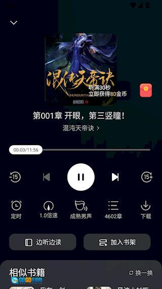 进入阅读界面后,轻点屏幕中间区域,会弹出“听书”按钮,点击该按钮即可开始听书。