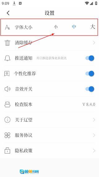 进入【设置】界面后,你可以对【字体大小】进行小、中、大三个档位的调整,同时也能进行清除缓存、开启或关闭推送通知等操作,从而个性化定制应用的使用感受。