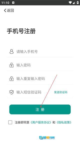 在手机号注册界面,按顺序输入手机号、密码、验证码,勾选相关协议后点击【注册】按钮,即可完成账号注册流程。