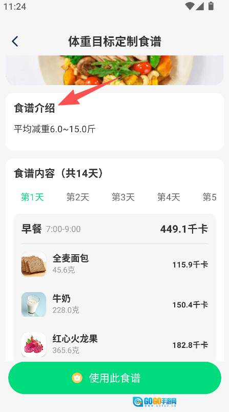选择减重食谱后,就能查看根据体重目标定制的食谱详细内容。