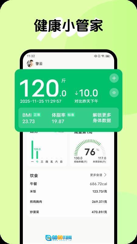 《健康小管家》这款软件专注于体重与饮食管理,不仅能记录体重数据并同步显示BMI和体脂率,还可直观呈现体重变化趋势;用户能设置专属体重目标,获取个性化的饮食与运动规划方案;的饮食板块提供维持、减重、增重等不同需求的食谱,针对定制体重目标的食谱更包含多日饮食安排及各餐卡路里详情,全方位助力用户管理自身健康状态。