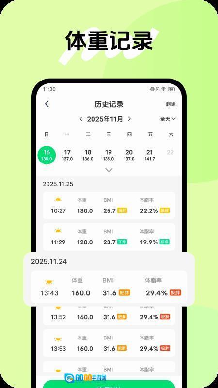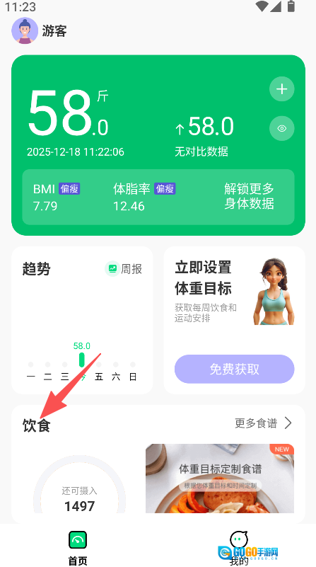 可以记录体重并显示BMI体脂率相关数据,还能设定体重目标,从而获得与之对应的饮食和运动规划。