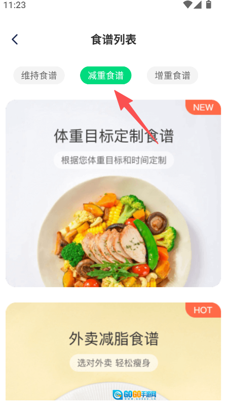 支持进入饮食板块,点击更多食谱即可查看维持、减重、增重类的食谱列表。