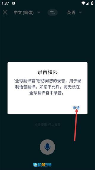 触发该功能后,系统会弹出录音权限的申请窗口,点击【申请】按钮完成录音权限的授权操作,就能正常使用同声传译功能了。