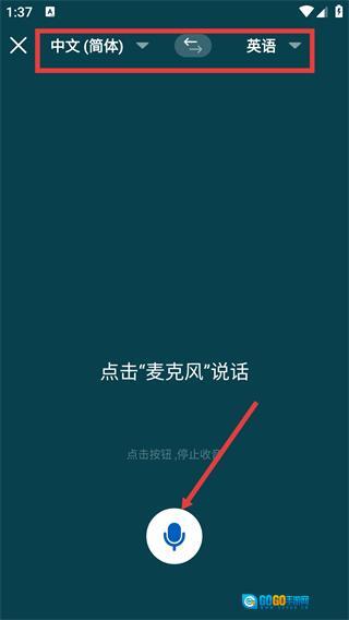 在同声传译界面,需先确认源语言(例如中文)与目标语言(例如英语)的选择,随后点击麦克风按钮来启动该功能。