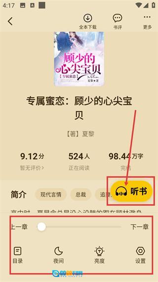 在小说详情页面,点击【听书】按钮就能开启听书模式,另外也可以通过【目录】-【亮度】来调整阅读相关设置,从而提升阅读体验。