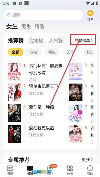在应用主界面点击【完整榜单】,即可进入详细榜单页面,查看更多分类的小说榜单内容,以此满足不同的阅读需求。
