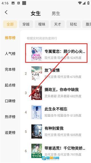 进入【完整榜单】的女生频道后,点击【专属蜜恋:顾少的心尖宝贝】这个条目,就能进入小说详情页查看相关信息。