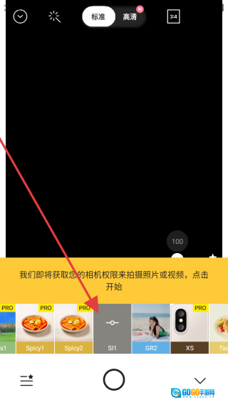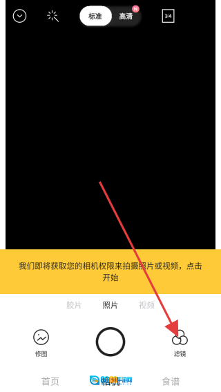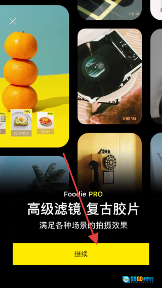 1、在Foodie滤镜介绍页面,点击黄色的继续按钮,即可进入相机功能界面。