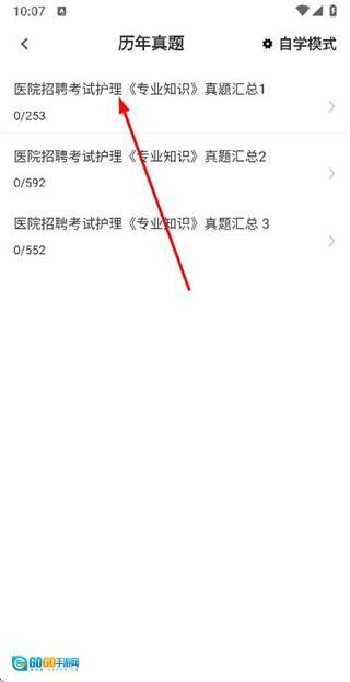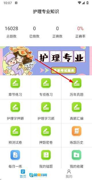 1、在护理专业知识首页找到并点击“历年真题”选项,即可进入历年真题页面。