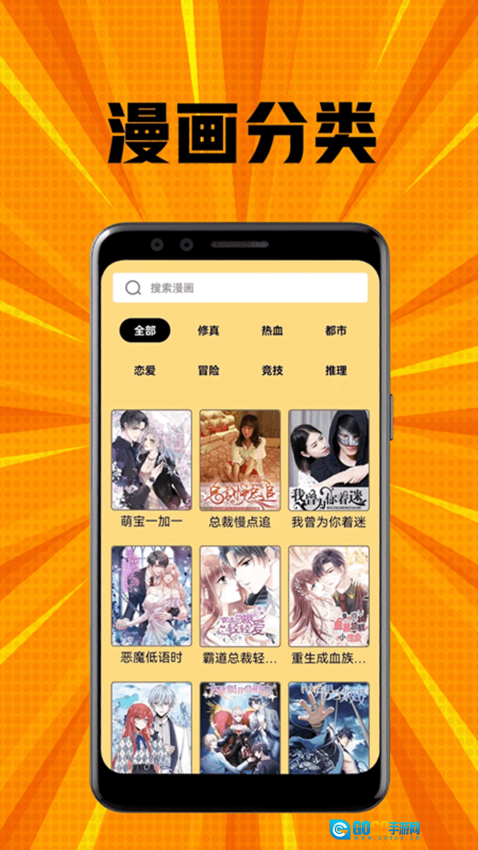平台设有顶部搜索框,用户可通过它搜索漫画;同时配置了多种分类标签,涵盖全部、修真、热血等类别。