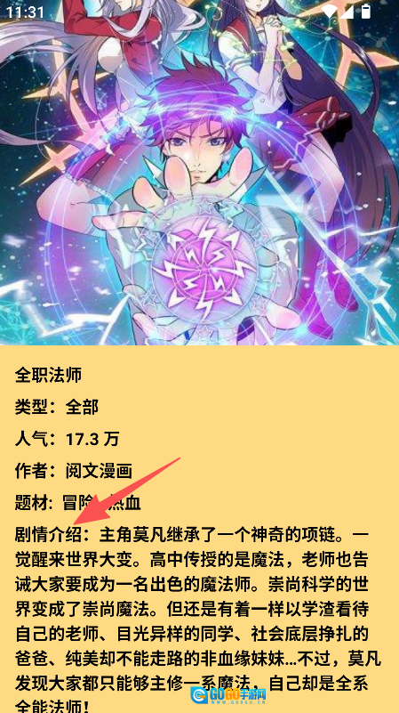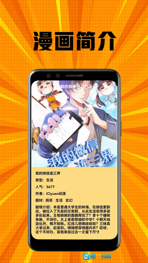 点击目标漫画,就能查看它的类型、人气、作者、题材以及剧情介绍。