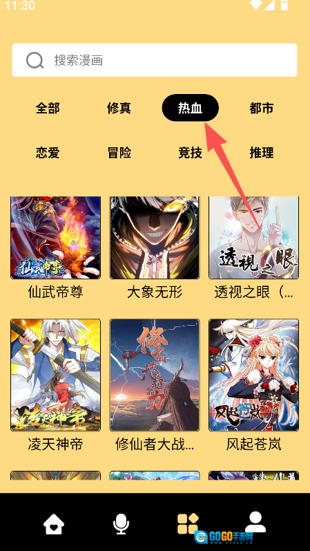 你可以在搜索框下方挑选对应的分类标签,比如选择热血分类,就能查看相关的漫画内容。