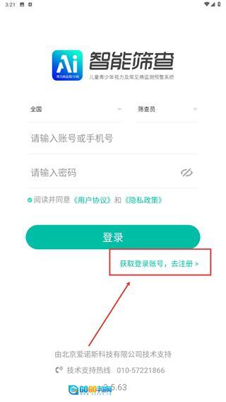 在“获取登录账号”页面,点击【去注册】按钮,即可进入注册信息填写界面。