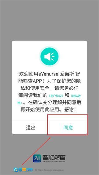在智能筛查的启动页面,点击【同意】按钮,确认同意用户协议和隐私政策后,即可进入登录界面。