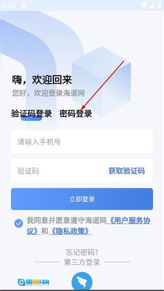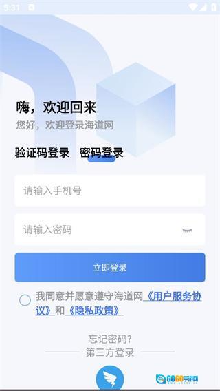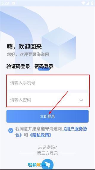 1、在海道网弹出的用户协议和隐私政策提示框中,点击同意按钮后,即可进入登录页面。